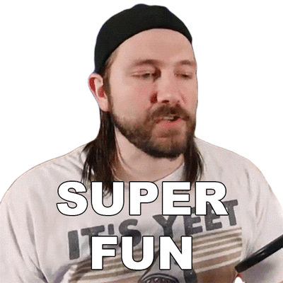 Michael Kupris, wearing a 'SUPER FUN IT'S YEET' shirt, expresses excitement in this animated sticker.