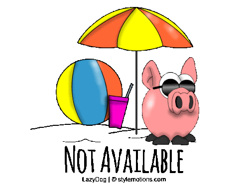 a cartoon of a pig sitting under an umbrella with a beach ball and a drink
