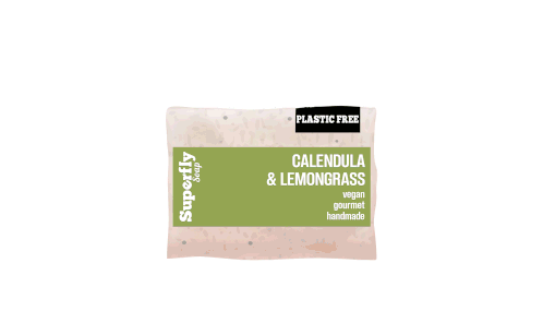 A Superfly Soap package for Calendula & Lemongrass, highlighting its plastic-free and compostable packaging.