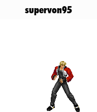 Supervon95, a pixel art character, transforms with glowing purple energy and wings, ready for action.