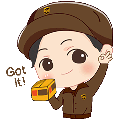 A cheerful UPS delivery person in uniform holds a package, winks, and makes an 'OK' gesture with 'Got It!' text.