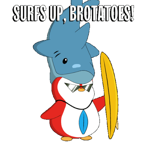 A cool Pudgy Penguin character, wearing sunglasses and a shark hat, ready to surf with a surfboard.