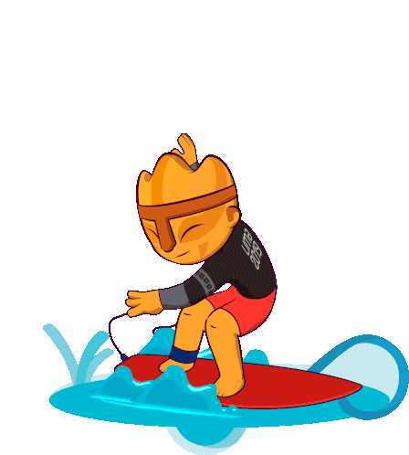 Milco, the Lima 2019 mascot, skillfully surfs on a red board, showcasing good balance and sport.