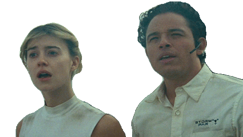 Kate Cooper and Javi from Twisters look shocked and surprised, reacting to an unseen event.