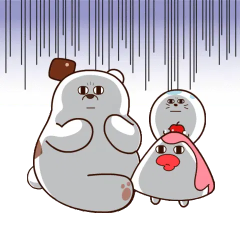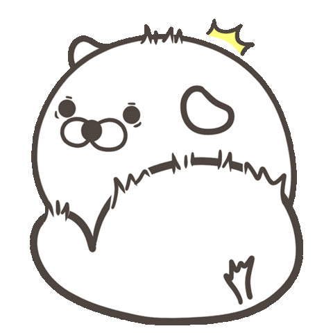 A cute, round cartoon animal reacts with a surprised expression, eyes widening and mouth opening.