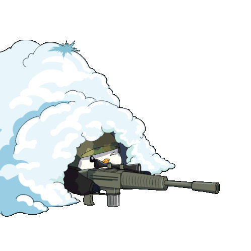 A cute Pudgy Penguin soldier in camouflage and a helmet, aiming a sniper rifle from a snowy hideout, ready for survival.