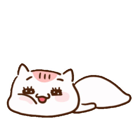 A cute cartoon cat-like character lies down, looking suspicious and unsure with its tongue out, then slides away.