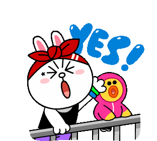 Cony, wearing a red bandana, shouts 'YES!' excitedly with Sally, showing off their swag from Line Friends.