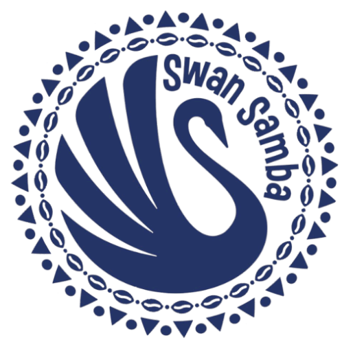 A stylish circular logo featuring a dark blue stylized swan with the text "Swan Samba" and decorative patterns.