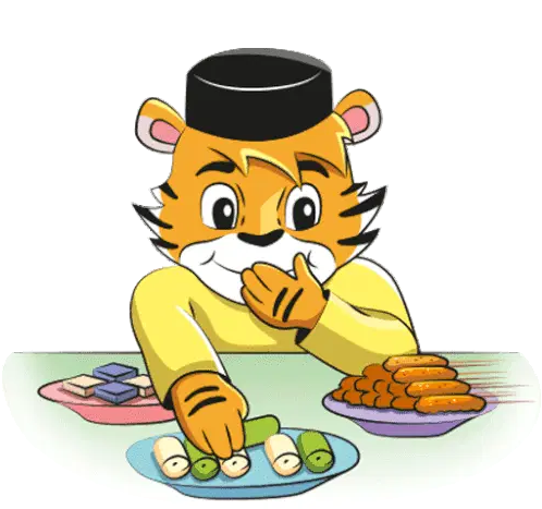 Pants Bear celebrates Hari Raya, happily holding a ketupat in a traditional green Baju Melayu outfit with a songkok.