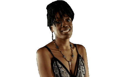 a woman in a bra and necklace is smiling with her hands in the air