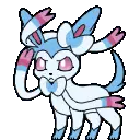 An adorable pixel art Sylveon from Pokémon is depicted climbing or hanging with its arms playfully raised.