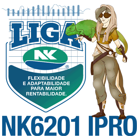 Animated sticker for Syngenta's NK6201 IPRO product, featuring the Liga NK logo, a character with a chameleon, and text about flexibility and profitability.