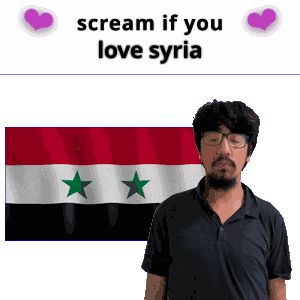 a man with glasses and a beard stands in front of a syrian flag and says scream if you love syria