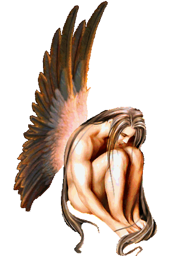A winged angel with long hair kneels in a contemplative or sad pose, featuring large, feathered wings.