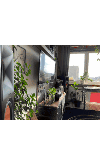 Szymon's Klipsch Reference Premiere speaker, featuring its distinctive orange cone, in a modern living room setup.