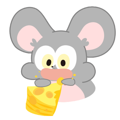 A cute grey cartoon mouse with big ears and eyes looks nervous while holding and tasting a piece of yellow cheese.