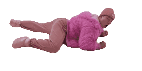 Taemin, also known as Ice Poseidon, lies on their stomach in a distinctive pink furry outfit.