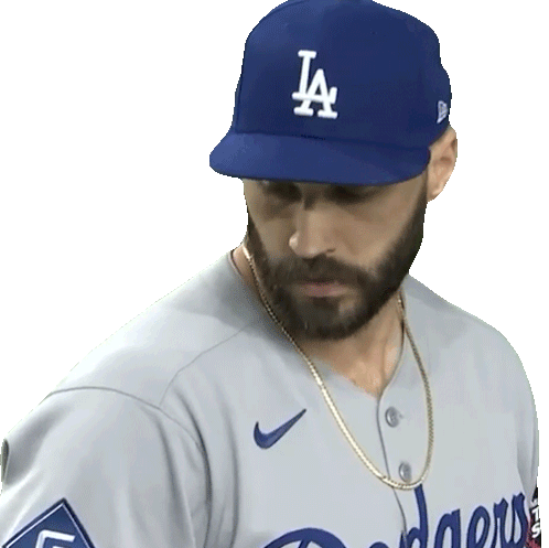 Tanner Scott, a Los Angeles Dodgers player, takes a moment to breathe, wearing his team's cap and jersey.