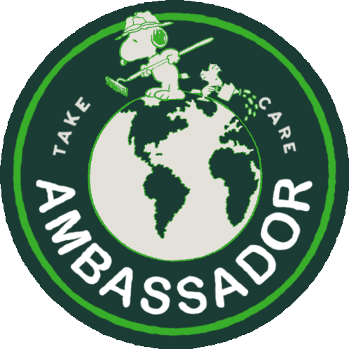 Snoopy, the Take Care Ambassador, stands on a globe with a broom and watering can, promoting environmental care.