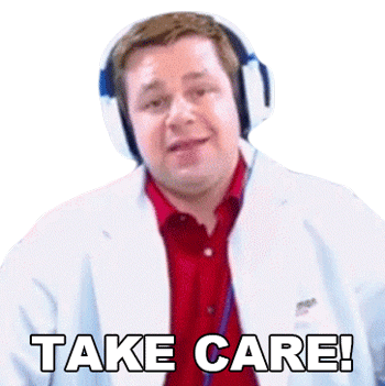 Professor K from The Pokemon Evolutionaries, wearing headphones and a lab coat, smiles and says "Take Care!".