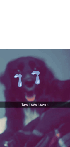 A blurry black dog with crying emojis and the text 'Take it take it take it' from a Snapchat post, expressing dramatic sadness.
