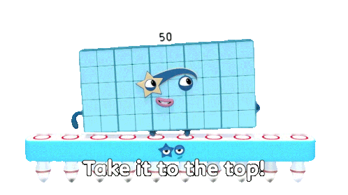 Numberblock Fifty, the light blue block character, holds up a star guitar with the caption 'Take it to the top!'