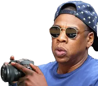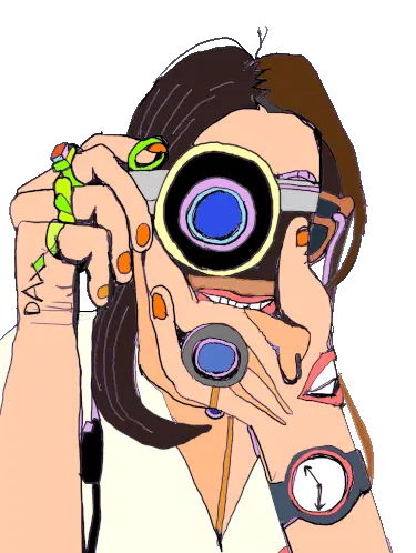 Bryan Ferry, dressed in a suit, holds two vintage cameras and appears to be snapping a photo.