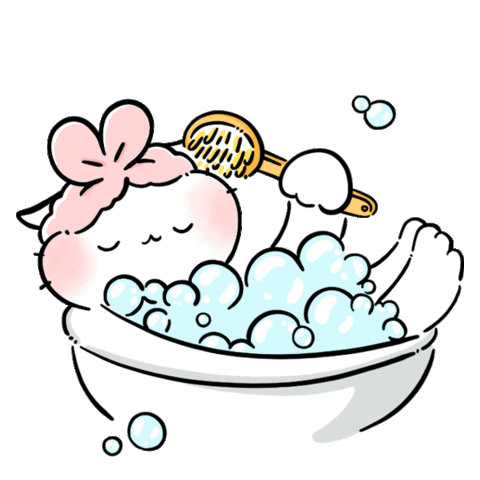 Adorable cartoon animal with a pink bow enjoying a relaxing bubble bath, scrubbing itself clean. Perfect for conveying cleanliness and relaxation.
