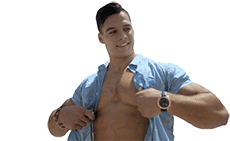 Jeremiah from Floribama Shore takes off his blue shirt, revealing his fit beach body with a smile.