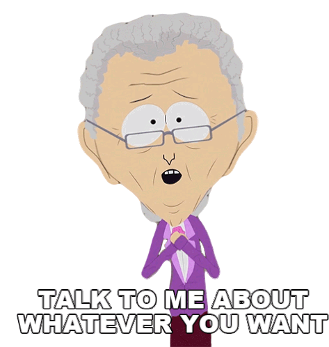 Mrs. Mackey Senior from South Park invites you to talk about anything, with the caption "TALK TO ME ABOUT WHATEVER YOU WANT".