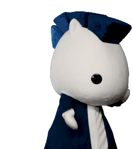 A cute blue and white mascot character gestures as if talking on a phone, moving its hand to its ear.