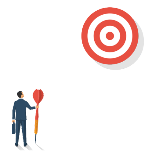A businessman successfully throws a dart, hitting the bullseye of a red and white target, symbolizing achievement.