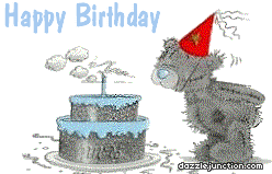 Tatty Teddy, wearing a party hat, blows out a candle on a two-tiered birthday cake, wishing 'Happy Birthday'.