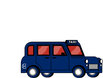 An animated blue taxi cab, reminiscent of a classic London black cab, drives across the screen.
