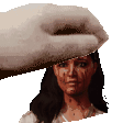 A hand touches Maria Flores' bloody face in a tense scene from The Texas Chainsaw Massacre.