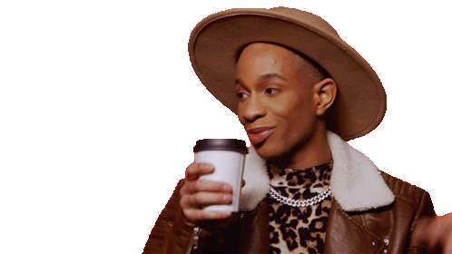 Robin Fierce sips from a white coffee cup, looking stylish in a hat and leopard print top.