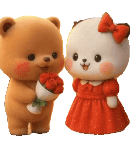 a teddy bear is holding a bouquet of red roses next to a white teddy bear in a red dress