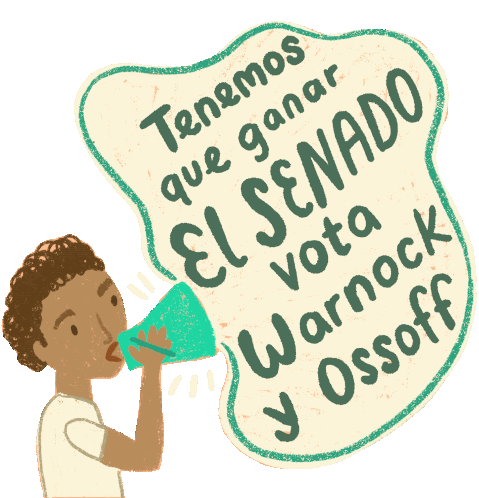 A person with a megaphone urges to win the Senate, encouraging votes for Warnock and Ossoff.