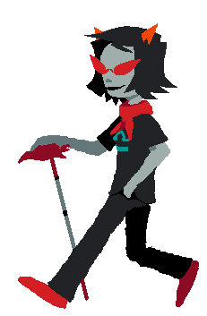 Terezi Pyrope, a Homestuck character, walks with her red cane and scarf in pixel art style.
