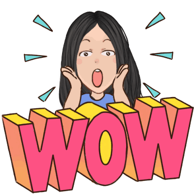 A cartoon girl with black hair looks surprised with wide eyes and an open mouth, exclaiming 'WOW' in a vibrant sticker.