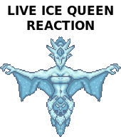 An animated pixel art sticker of the Terraria Ice Queen, featuring the 'LIVE ICE QUEEN REACTION' meme.