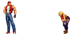 Terry Bogard and another fighter in pixel art style, standing in ready stances for a battle, on a clean white background.