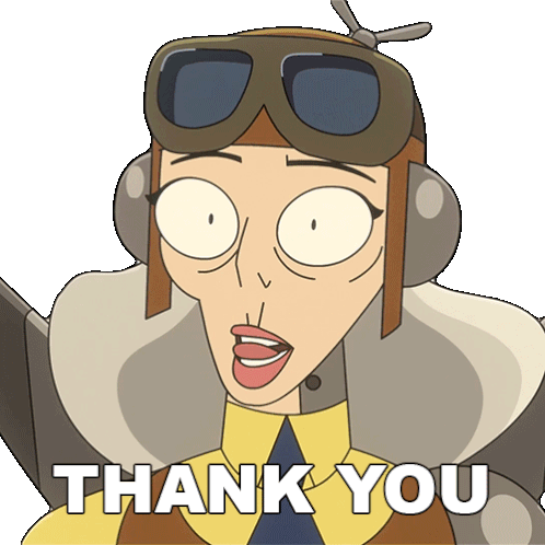 Amelia Earhart from Digman! animated series, wearing pilot gear and saying 'Thank You' with a distinct expression.