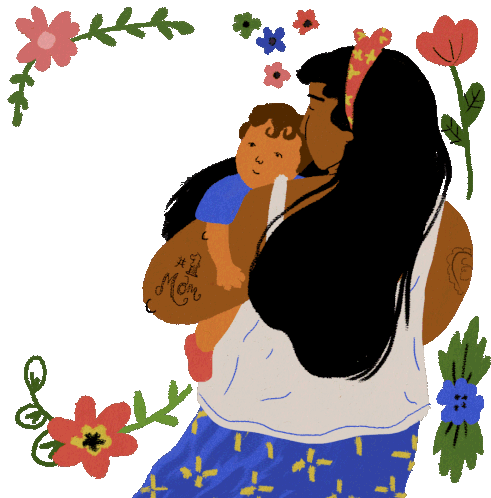 An illustrated sticker of an immigrant mother holding her child, with a thought bubble expressing gratitude: 'Thank you for risking everything so that I could dream big.'