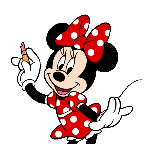 Minnie Mouse, wearing a red polka dot dress, winks and holds a lipstick while saying "Thank you!".
