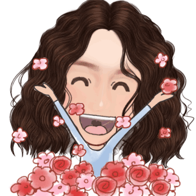 A cheerful cartoon woman with curly brown hair, surrounded by vibrant pink and red flowers, expressing gratitude.