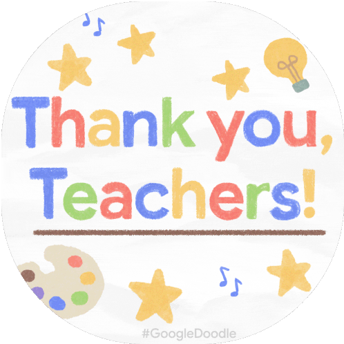 A vibrant Google Doodle sticker saying 'Thank you, Teachers!' with animated school-themed doodles like pencils and stars.