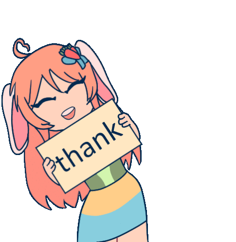 A cute animated bunny girl character sways and holds a 'you!' sign, expressing thanks and appreciation.