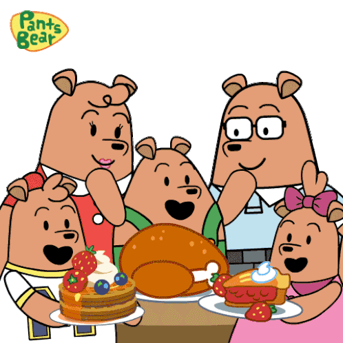 The Pants Bear family gathers for a joyful Thanksgiving meal, featuring a roasted turkey, pancakes, and pie.